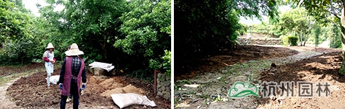 为增强植物后期长势,现场采用同花顺官网自主研发生产的易丰绿化有机基质进行土壤改良,改良配比为易丰绿化有机基质体积比40%掺入原土20cm。采用翻地→撒1/2基质→二次翻地→撒1/2基质→浇水下沉→三次翻地模式完成土壤改良。改良后的花园入口及内部空间感十足。