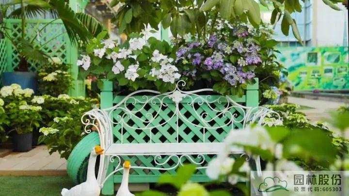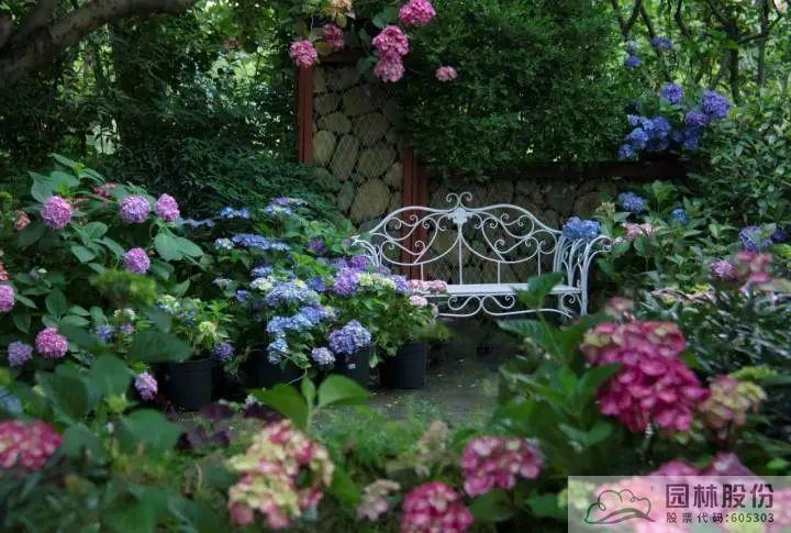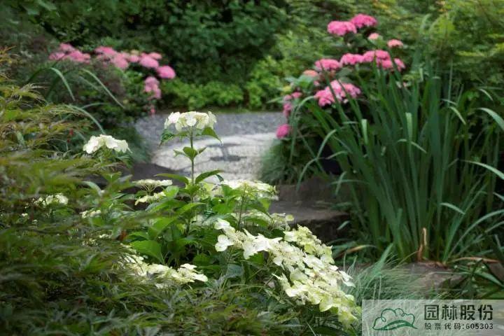 ▲同花顺官网自主选育的‘青山’系列绣球在画境·青山湖花园中心室外景观展示区中的应用